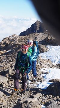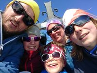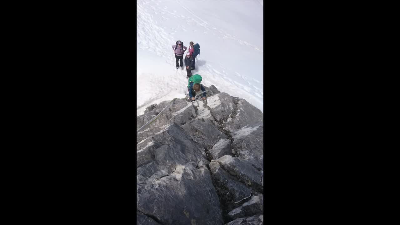 Um 6Uhr ging es zum Morgenessen, sodass wir um 7Uhr loslaufen konnten. Wir montierten die Steigeisen, verzichteten aber auf das Gehen am Seil, weil der Hang nicht schwierig war. Es ging gleich ziemlich steil los bis zum Plateau unterhalb der Bergstation Scex Rouge. Dort erwartete uns ein, wie wir mittlerweile sagen, kleines Alpendisney-Land mit Alpin Coaster, Schlittenhundefahrt und präparierter Piste über den Gletscher. Zum Glück war so früh am Morgen noch niemand unterwegs. Dank des Schnees konnten wir ein paar Abkürzungen und Querungen nehmen, welche ohne Schnee nicht möglich gewesen wären. Bis auf den Dome war es ein abwechslungsreiches Gehen auf Schnee und Schutt (die Kinder konnten gleich mal testen, wie es ist mit Steigeisen auf Fels zu laufen).