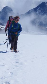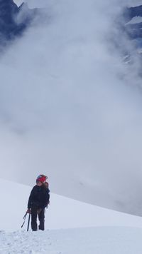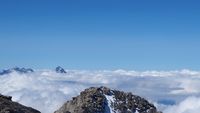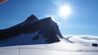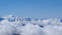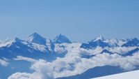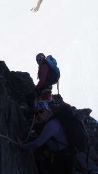 Nach dem Dome erwartete uns die Schlüsselstelle, Abklettern im 2./3. Schwierigkeitsgrad mit Steigeisen. Auch dank der Fixseile war es für alle problemlos zu meistern. Danach ging es auf den Gletscher. Dieser war nicht sehr steil und dank des vielen Schnees waren die spärlich vorhandenen Spalten gut zugedeckt. Somit entschieden wir uns weiterhin nicht am Seil zu gehen, sondern jeder einzeln für sich, was das Gehen deutlich angenehmer macht. Es folgten noch ein kleiner Aufschwung und dann waren wir auf dem Gipfelgrat. Ein wunderschönes Gipfelkreuz markiert die höchste Stelle. Die Sicht auf die Walliser Berge (z.B. Matterhorn), die französischen Alpen (Mont Blanc) und Richtung Berner Oberland war dank der Wolken- und Nebelbänke im Tal mystisch.